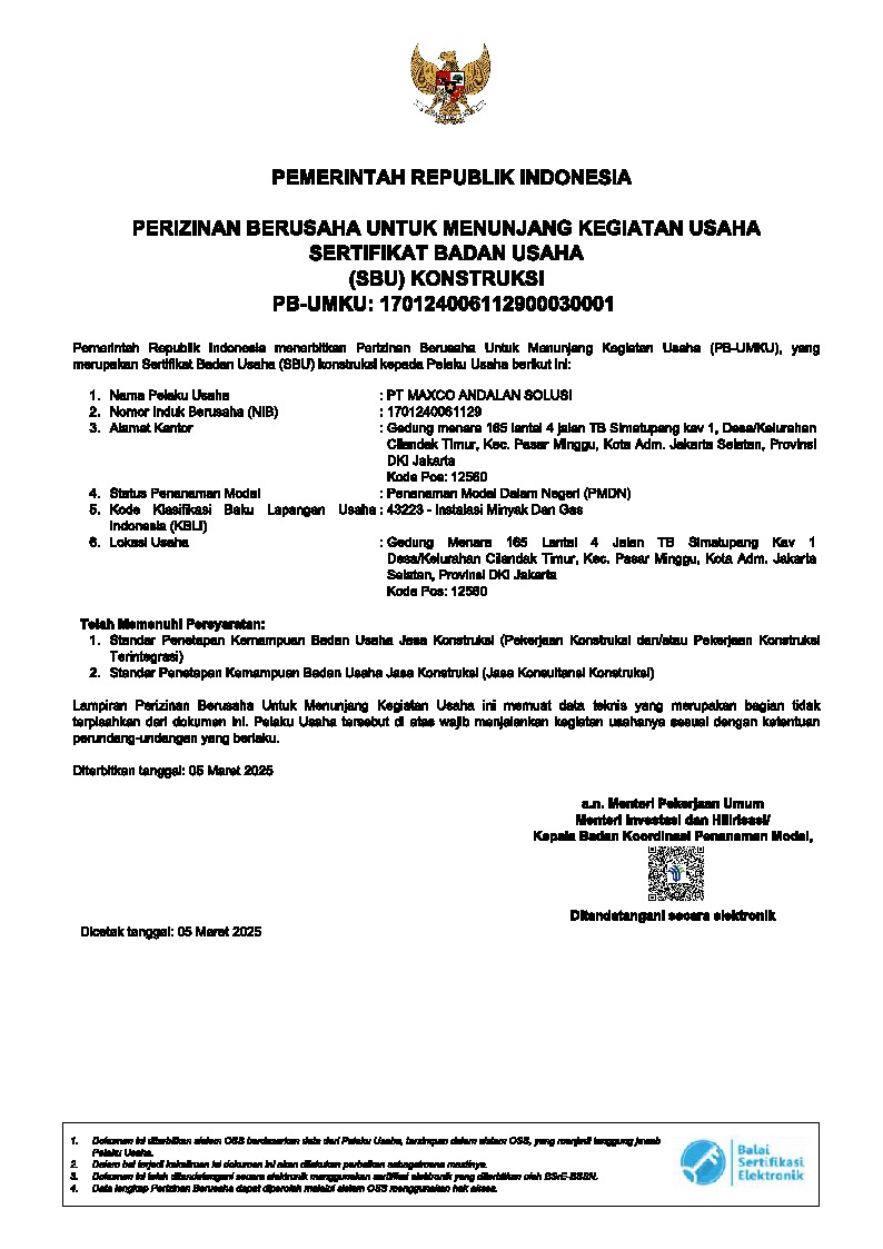 PT. Maxco Andalan Solusi has established since 2024 as Engineering, Procurement, Construction, General Supplier, Operation and Maintenance Services and Project Management Consultant for oil and gas industry.